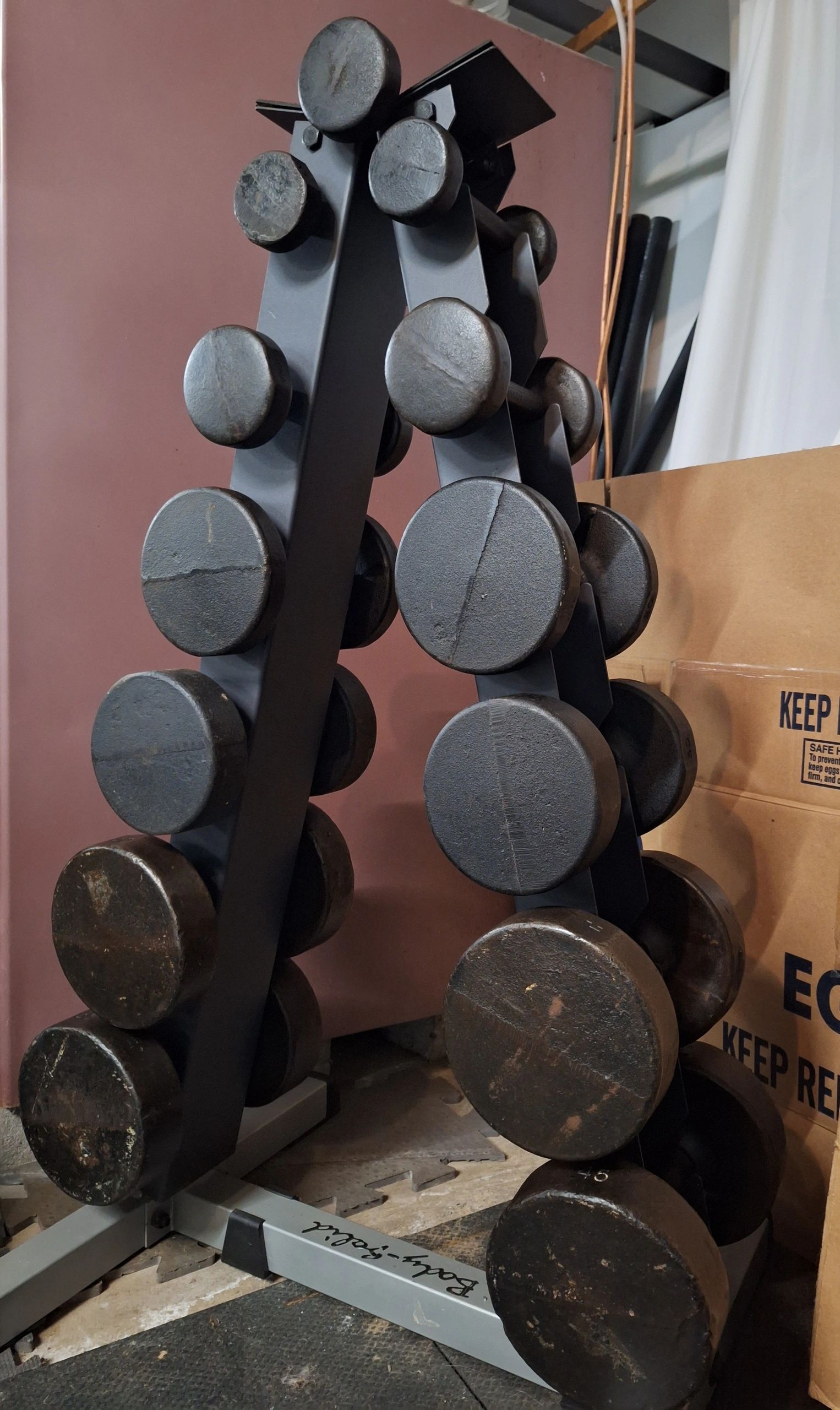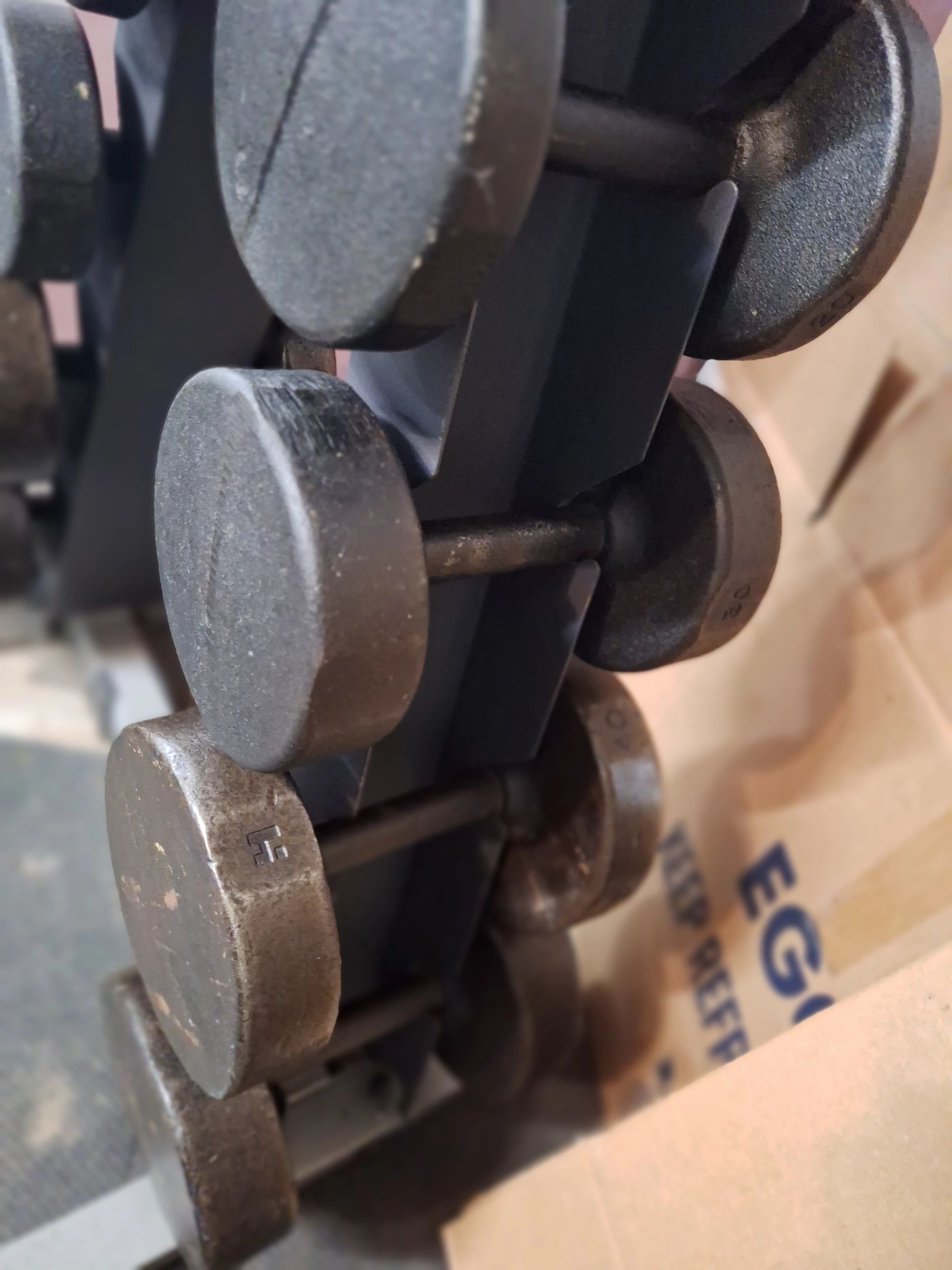 The set is in pairs of; 5s, 10s, 20s, 30s, 40s, 45s & a single 7. All are USA except for 5s & 10s are China. Looking to buy the dumbbells I am missing to complet